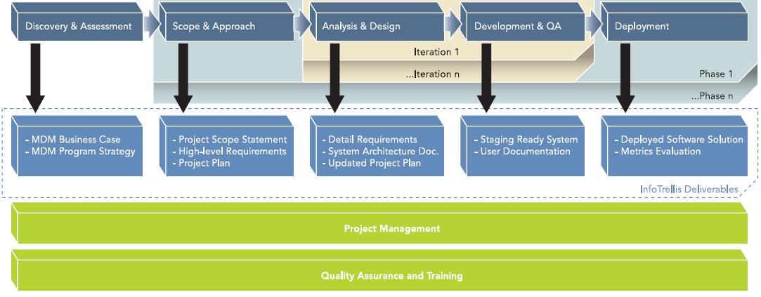 Every project comes with its own set of challenges and are no different. At InfoTrellis, we have built an effective methodology for Project Management, through years of experience in managing MDM projects. We like to call it as “InfoTrellis Smart MDM Methodology”.